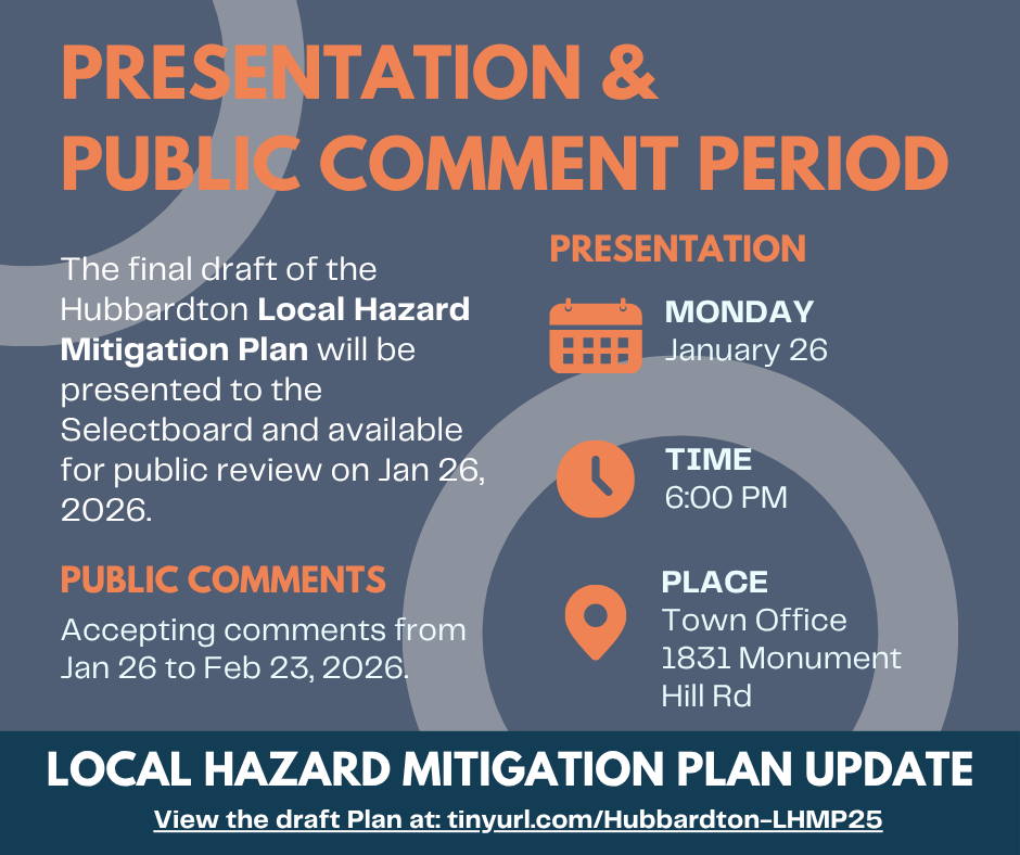 The final draft of the Hubbardton Local Hazard Mitigation Plan will be presented to the Selectboard on Monday, January 26 at 6:00 PM. Attend the meeting in person at 1831 Monument Hill Road to learn more about what the Town has accomplished since September. The Plan will also be available for public review and comments from January 26 to February 23, 2026. For more information about the Hubbardton Plan update, visit http://tinyurl.com/hubbardton-lhmp25.