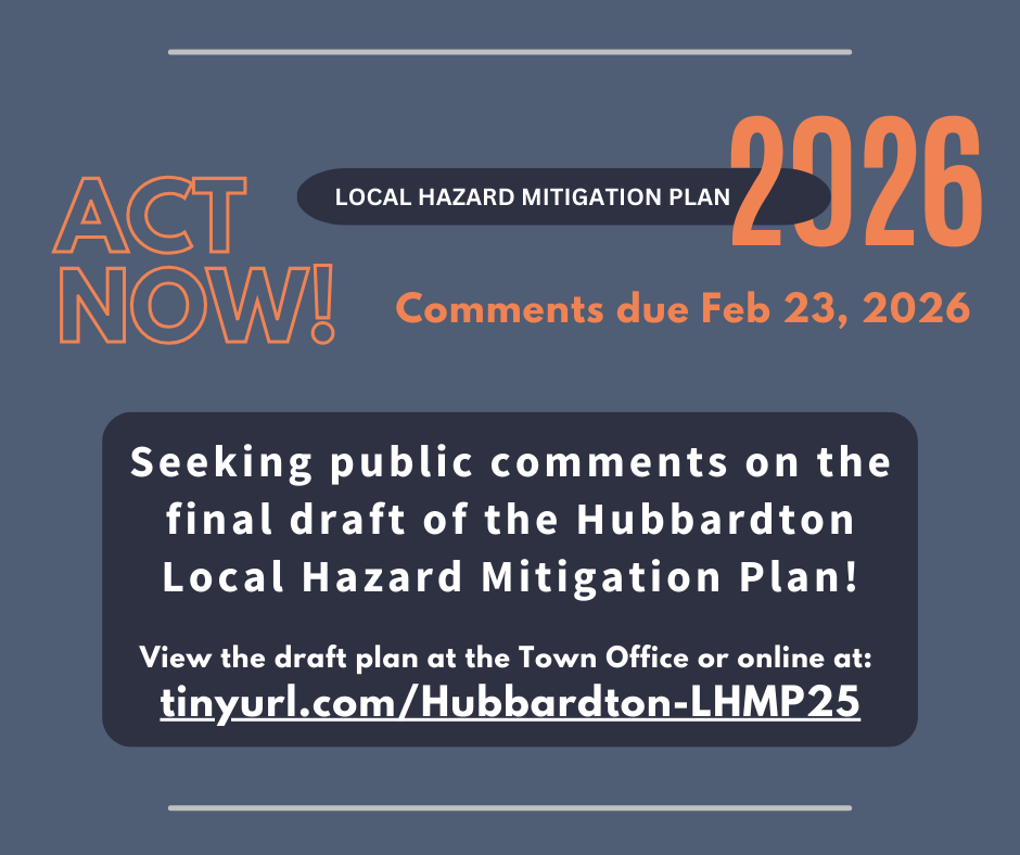 The final draft of the Hubbardton Local Hazard Mitigation Plan will be presented to the Selectboard on Monday, January 26 at 6:00 PM. Attend the meeting in person at 1831 Monument Hill Road to learn more about what the Town has accomplished since September. The Plan will also be available for public review and comments from January 26 to February 23, 2026. For more information about the Hubbardton Plan update, visit http://tinyurl.com/hubbardton-lhmp25.