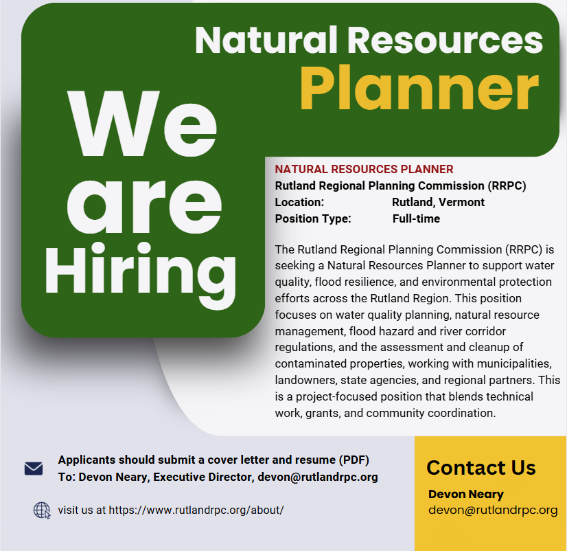 The Rutland Regional Planning Commission (RRPC) is seeking a Natural Resources Planner to support water quality, flood resilience, and environmental protection efforts across the Rutland Region. This position focuses on water quality planning, natural resource management, flood hazard and river corridor regulations, and the assessment and cleanup of contaminated properties, working with municipalities, landowners, state agencies, and regional partners. This is a project-focused position that blends technical work, grants, and community coordination. Read the full job posting HERE.