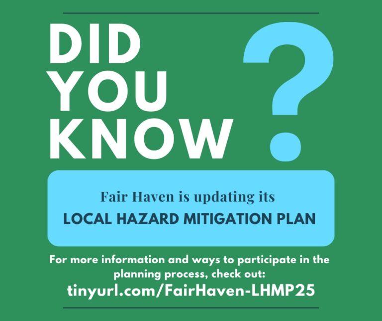 A final draft of the Fair Haven Local Hazard Mitigation Plan update is now available for public review and comment. The comment period is open from April 1 to April 15, 2025. View the draft plan at Town Hall or online at: tinyurl.com/FairHaven-LHMP25.