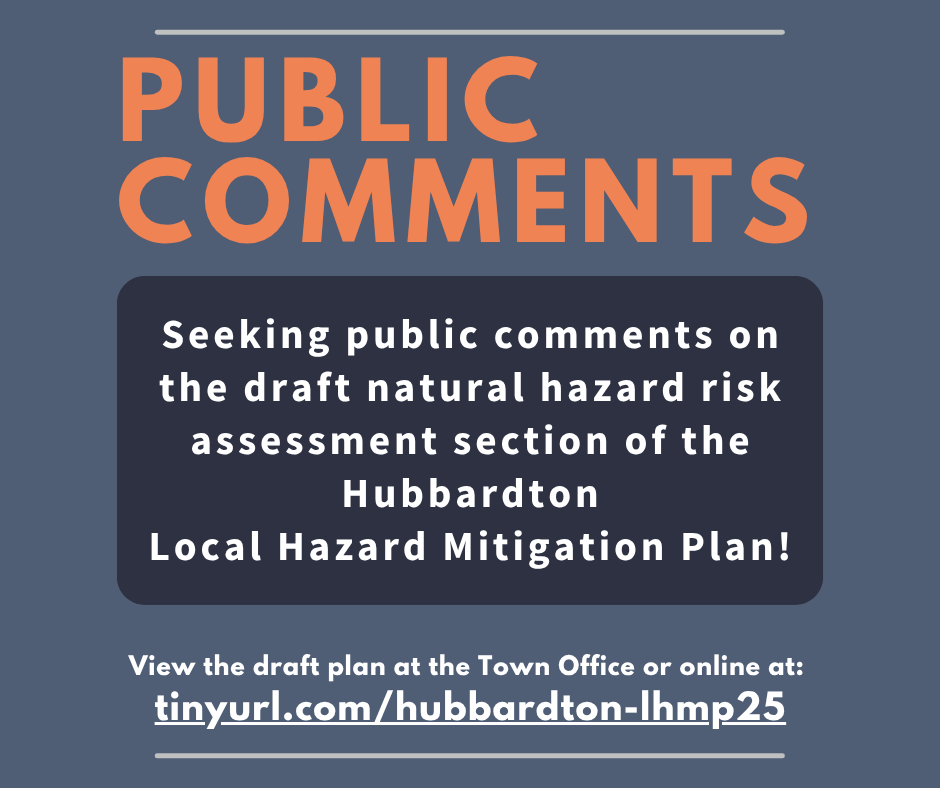 Hubbardton residents: the current draft of the 2025 Local Hazard Mitigation Plan is available for your review! From September 22 to October 6, submit any comments you may have regarding the 2025 Local Hazard Mitigation Plan update to [email protected]. You may also attend the October 6 special Selectboard meeting to provide your feedback in person.