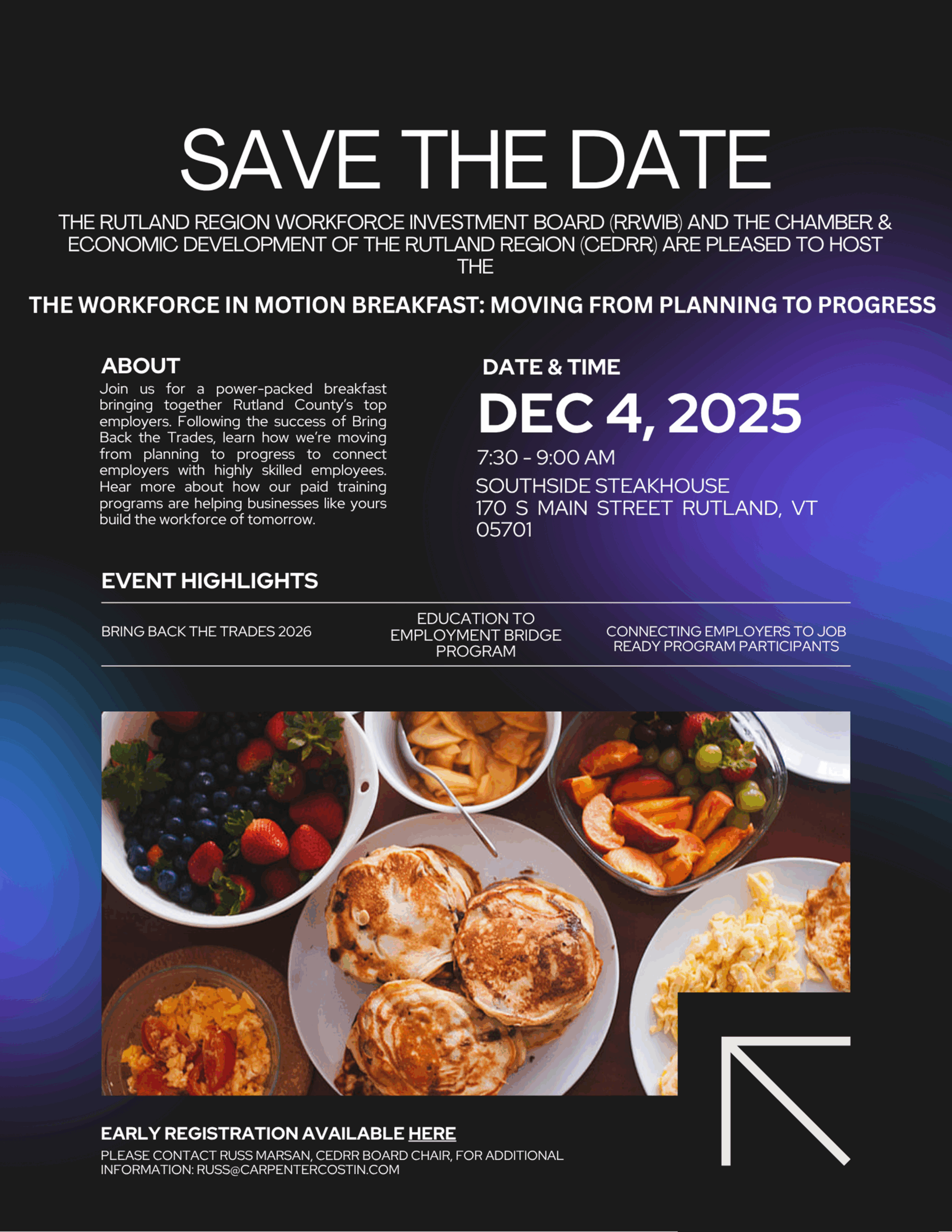 The Rutland Region Workforce Investment Board (RRWIB) and the Chamber and Economic Development of the Rutland Region (CEDRR) are pleased to host the Workforce in Motion Breakfast: Moving from Planning to Progress.